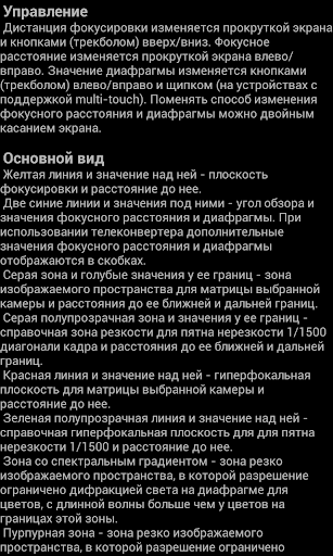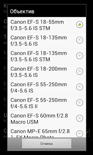 Профили для камер и цифровых задников формата APS-H и больше, объективов профессионального уровня, а также функция избранного списка камер доступны в "Про"-версии https://play.google.com/store/apps/details?id=com.duke.dofcalcpro