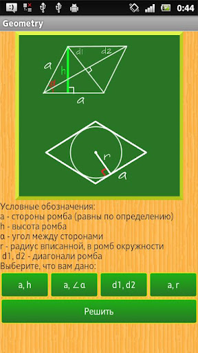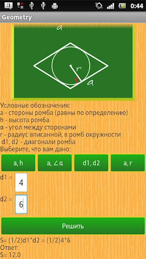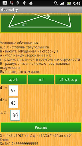 Шпаргалка по геометрии. Считает площади различных фигур. В дальнейшем будут добавляться новые функции такие как расчет объема.