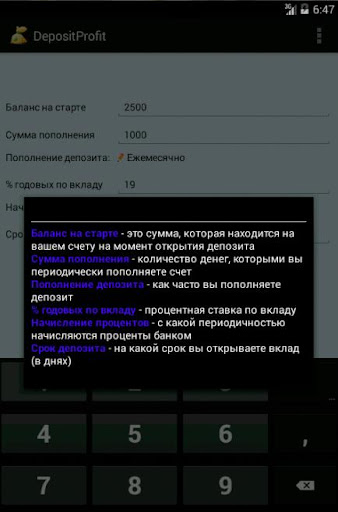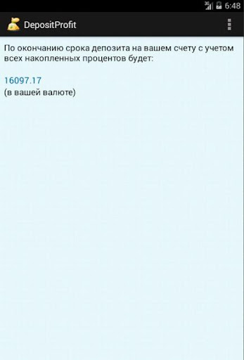 Приложение "ДепозитПрофит" позволяет рассчитать прибыль от банковского депозита за определенное количество дней. Просто укажите нужные данные и нажмите "Рассчитать".
