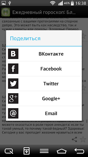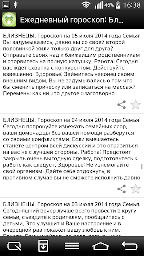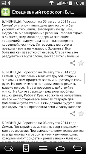 Устанавливайте приложение “ Ежедневный гороскоп: Близнецы”. Делитесь с друзьями и близкими в социальных сетях: Вконтакте, Facebook, Twitter или e-mail. Сохраняйте самые интересные прогнозы в Избранном!
