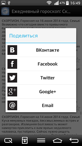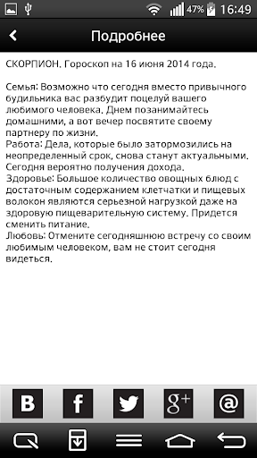 Устанавливайте приложение “Ежедневный гороскоп: Скорпион”. Делитесь с друзьями и близкими в социальных сетях: Вконтакте, Facebook, Twitter или e-mail. Сохраняйте самые интересные прогнозы в Избранном!