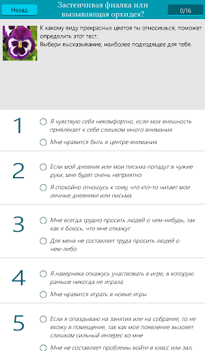 Личностные тесты помогут тебе лучше понять себя и оценить свой характер, узнать свои сильные и слабые стороны. Ты узнаешь, к какому психотипу ты относишься, нужно ли тебе носить часы и учиться сдерживать бурные страсти, или же по тебе можно сверять время и твоей сдержанности позавидует сама Снежная королева? Можешь ли ты быть душой компании и грозит ли тебе финансовый кризис каждый раз, как ты отправляешься в магазин купить колготки? Кто ты, нежная фиалка или вызывающая орхидея? Понимание себя – залог душевного равновесия и гармонии в отношениях с другими людьми. Понимая себя, ты убережешься от разочарований и сможешь использовать свои достоинства на полную катушку.