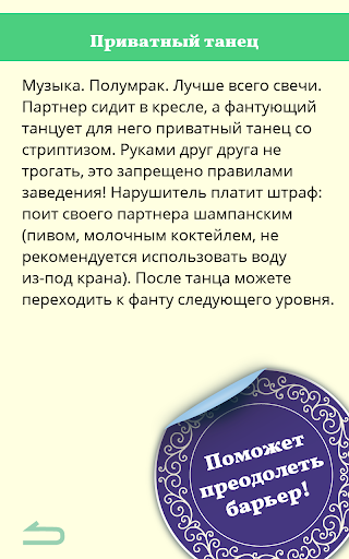 Взрослые игры невероятно разнообразят нашу жизнь. Это нравится и девушкам, и мужчинам. Сто оригинальных заданий, разработанных лучшими психологами, помогут начать отношения, достичь взаимопонимания и гармонии в сексе. Легкий флирт и огненные ролевые игры - для вас двоих в новом приложении Секс-фанты.