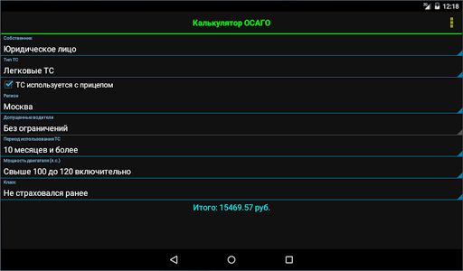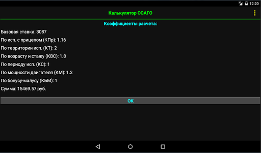 Данный калькулятор предназначен для расчёта стоимости полиса ОСАГО с учётом изменений, вступивших в силу с 01.04.2015 г. и с 12.04.2015 г. В программе реализована удобная возможность проверки КБМ по базе РСА. Так же присутствует функция просмотра коэффициентов расчёта и функция самостоятельной корректировки базовых тарифов. Доступны все регионы РФ. Через программу можно оформить Полис ОСАГО и Диагностическую карту онлайн не выходя из дома.