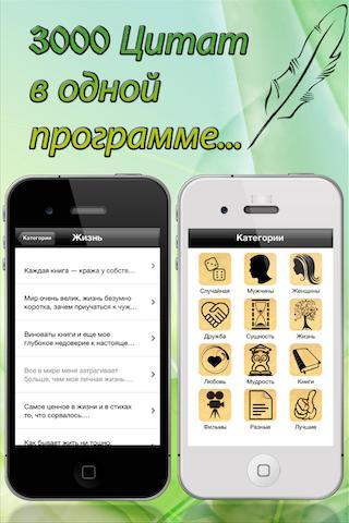 Данная программа вобрала в себя множество цитат и афоризмов великих людей, замечательных фильмов и книг, разбитых для удобства на категории. Делитесь понравившимися высказываниями с друзьями на Facebook или Vkontakte.