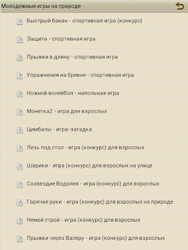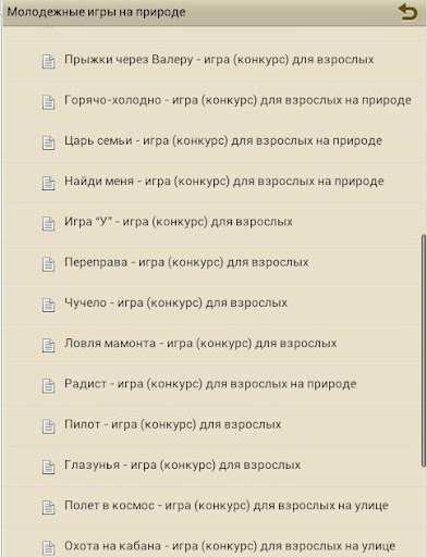 Лучший сборник Взрослых молодежных игр на природе (или же на улице). С такой книгой Вы станете заводилой любой компании, к Вам будут тянуться другие. Вы не соскучитесь. Много конкурсов, тематических игр. Искать долго не нужно - просто выбирайте игру и станьте любимцем компании.