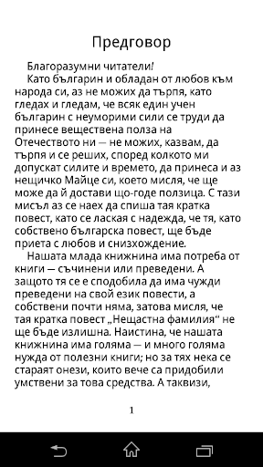 За да ползвате приложението не е необходимо да сваляте допълнителен четец. Всяко произведение е самостоятелна апликация. Вие преценявате кое от тях да оставите на телефона си или кое да изтриете. Целим да дадем възможността на хората да разполагат с библиотека от любимите си български произведения.