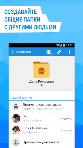 * Создавайте общие папки с другими пользователями и вместе добавляйте в них любые файлы. Соберите вместе с друзьями в одну папку все фото с вечеринки или путешествия. Организуйте групповую работу с документами, используя общую папку с коллегами. Сохраняйте вместе с близкими все дорогие вашей семье события в общий семейный альбом.