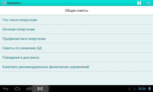 - Общие советы (что такое гипертония, лечение гипертонии, профилактика гипертонии, советы по снижению АД, поведение в дни риска, комплекс рекомендованных физических упражнений).