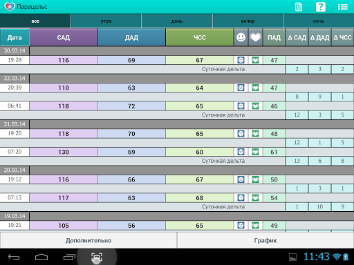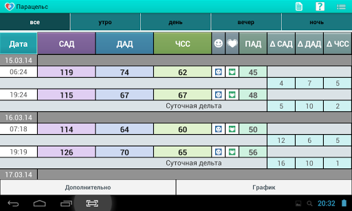 Данные об артериальном давлении можно фильтровать по времени суток (все, утро, день, вечер, ночь).