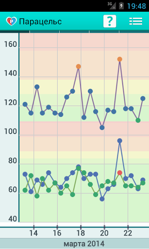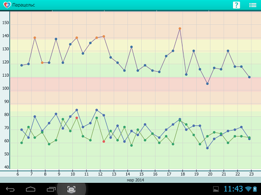 График динамики САД, ДАД, ЧСС, вес, окружность талии, окружность бедер от времени (дополнительно на графике отражаются: наличие аритмии, самочувствие, нормы ВОЗ 2013 года), любой из перечисленных параметров можно независимо отключить.