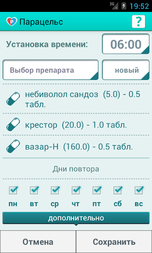 Позволяет установить неограниченное число напоминаний с выбором времени срабатывания, наименованием препарата, дозы приема препарата, возможна установка повтора и периода напоминания. Технология напоминания позволяет производить запись приема препаратов, откладывание приема и отказ от приема не заходя в программу. В многопользовательском режиме для каждого пользователя создаются индивидуальные напоминания.