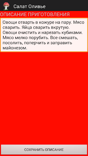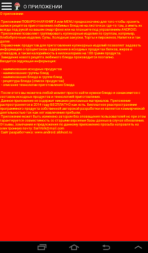 Данное приложение разработано для того, чтобы иметь всегда под рукой нужный рецепт приготовления кулинарного блюда. Обычно хозяйки записывают рецепты на листочках бумаги или в заветную тетрадку и хранят их в шкафчике на кухне. Теперь можно обратиться к рецепту в любом месте и в любое время так как ваш смартфон или планшет всегда рядом. Достаточно один раз занести рецепт и он будет доступен в удобной стандартизированной форме всегда и везде. Режим сохранения и восстановления базы данных в отдельном файле в отдельной папке вашего устройства позволит вам делиться всей рецептурой с друзьями или полностью восстанавливать поваренную книгу в случаен смены устройства или в случае полной перезагрузки устройства. Достаточно послать сохраненную базу данных на другой диск или на любое другое хранилище или по электронной почте. Удобно, просто, понятно.
