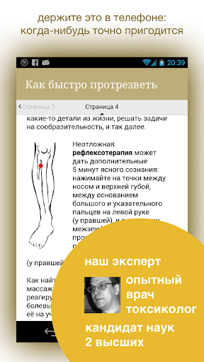 2. В вашем кармане будет полезнейший справочник. Знание того, как на самом деле воздействует алкоголь на организм поможет спасти здоровье (или жизнь) вам или вашим близким. Если вы думаете, что уже всё знаете из газет или от людей "умеющих пить", вы ошибаетесь.