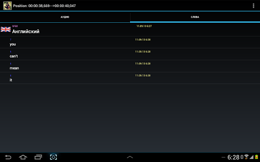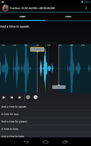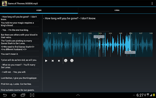 Приложение обеспечивает навигацию по аудио с помощью субтитров (при выборе фразы выделяется соответствующий фрагмент аудиозаписи на волновой диаграмме). Зацикленное проигрывание позволяет повторять фразу столько сколько необходимо.