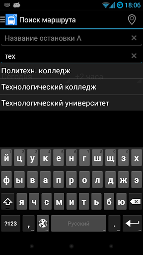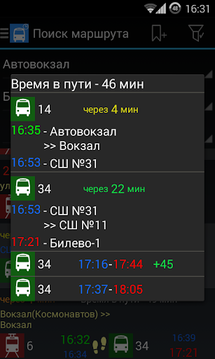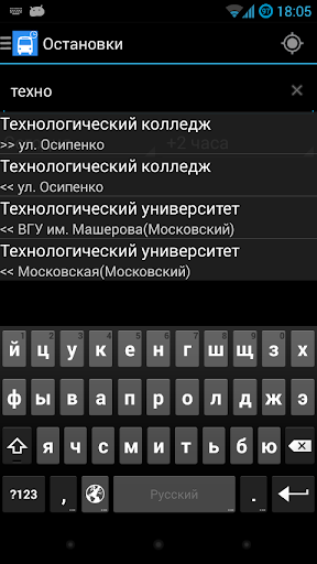 - поиск маршрута с учетом одной пересадки (частично с переходом на другие остановки);