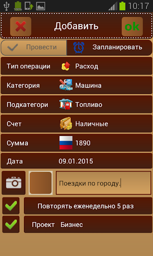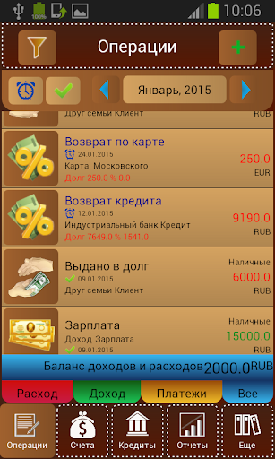 - Вести учет денег на разных счетах и разных валютах (наличные, банковские карты, электронные деньги, кредитные карты);