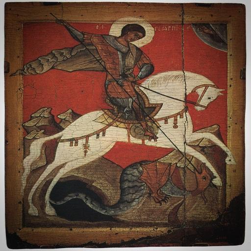 Житийная икона св. Георгия. В клеймах можно разглядеть различные пытки, в том числе и те, которых нет в стандартном списке — например, как его жгут в медном раскалённом докрасна быке