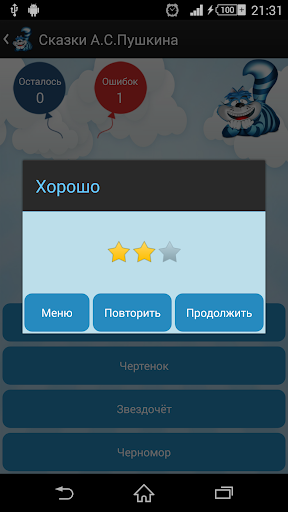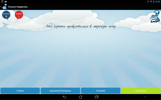 Сказочная викторина – приложение для детей младших классов, которое позволяет в игровой форме закрепить знания детей о содержании различных сказок, внешности и особенности характера героев этих сказок.