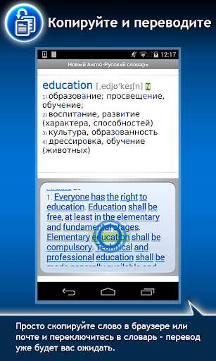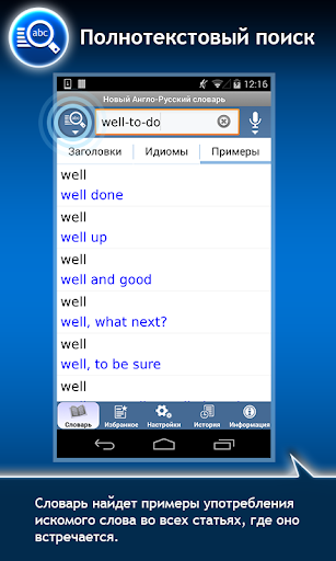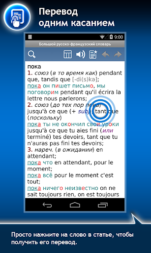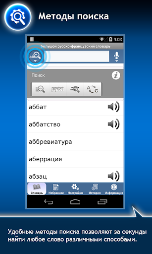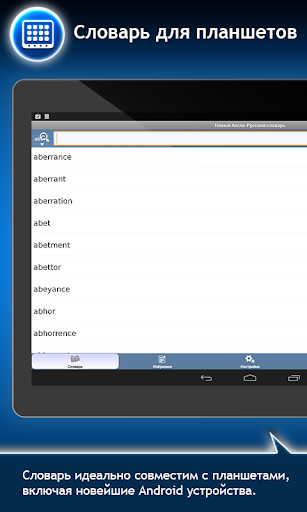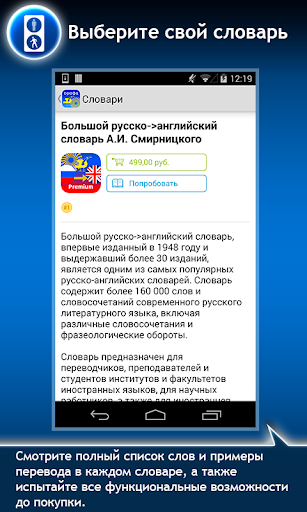 Вы можете легко и быстро ознакомиться с любым переводным, а также фразеологическим и толковым словарем, оценив функции мгновенного поиска и комфортного обучения слов, и при желании приобрести полную версию.