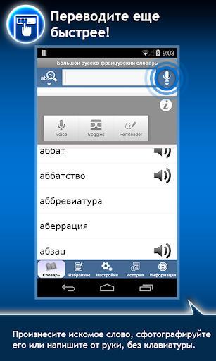 • Три альтернативных метода ввода: пишите искомое слово от руки при помощи PenReader, фотографируйте и переводите, используя сервис Google Goggles или произнесите.