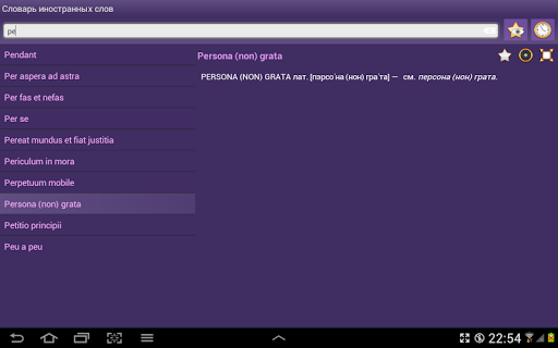 Словарь популярных иностранных слов и выражений (жаргонных слов и выражений, слов и выражений встречающихся в литературе в иностранном написании) поиск латинскому алфавиту, словарь содежит 700 слов и выражений. Справочник работает в режиме ОФФЛАЙН и не требует интернет-соединения для работы.