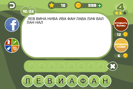 Чем больше слов Вы угадаете, тем больше получите очков. Также за угаданные слова даются монетки, которые можно использовать для покупки различных подсказок, открывать первые буквы в словах или слова целиком. Цель игры - решить все задания и пройти все уровни!