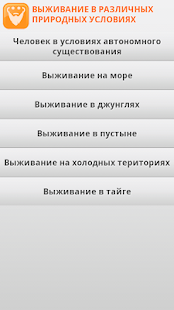 Приложение дает практические сведения по выживанию в различных природных условиях. Описаны способы поддержания здоровья, решение трудностей, обретение навыков выживания и разнообразная информация об опасностях которые могут Вас подстерегать.