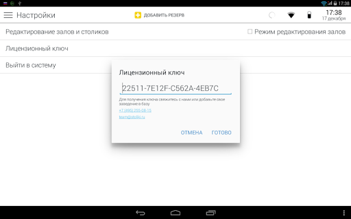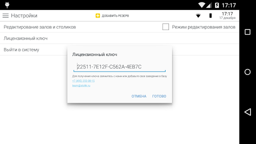 2) Лицензионный ключ, который мы с радостью вам выдадим в личном кабинете ресторатора по адресу http://cabinet.stoliki.ru. По этому ключу мы поймем, что заявку на резерв необходимо передать именно на ваше устройство. Если у вас еще нет доступа к личному кабинету, то вы можете добавить свое заведение по ссылке http://stoliki.ru/add/ и мы создадим вам ключ.