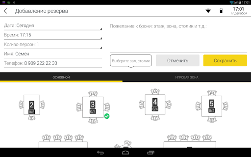 2) Введите данные о резерве: дата, время, количество персон, имя гостя, мобильный телефон и пожелания.