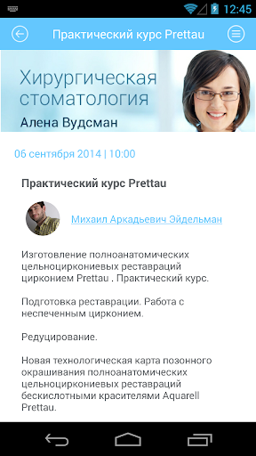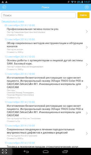 Приложение предназначено для врачей стоматологов и зубных техников, ассистентов и рентгенологов. Содержит полную информацию по обучениям от учебных центров и лекторов, описание учебных центров и биографии лекторов. Система поиска быстро находит информацию по запросу и позволяет в режиме online произвести запись на курс или ознакомиться с новинками. Пользователь может сортировать обучение по категориям – платные курсы / бесплатные курсы, а так же курсы, проводимые за границей.