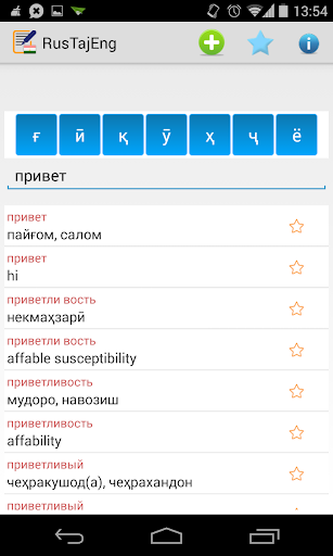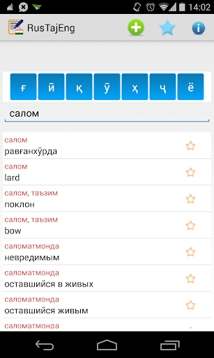 *Есть возможность добавления нужных или интересных слов в закладки. Доступ к ним возможен из одноименного пункта меню.