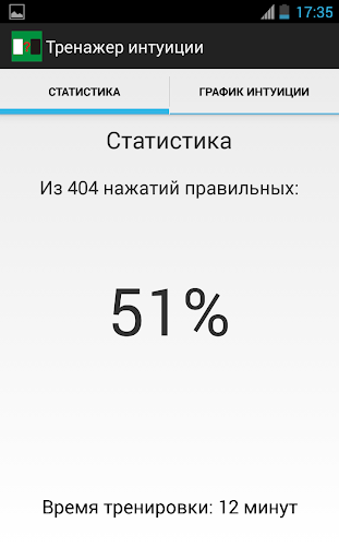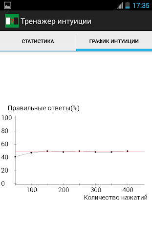 В меню есть статистика и настройки. В статистике отображается количество нажатий и процент правильно выбранных карт, а так же график интуиции (начинает отображаться после 150 нажатий). Настройки позволяют включать звук и вибрацию.