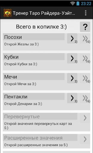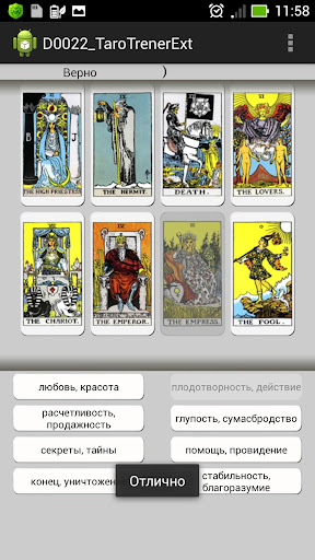 Ценность этой колоды в многообразии символов изображенных на каждой карте. Именно символика карт Таро Райдера позволяет применять их в широком спектре эзотерических практик. Для того, чтобы ваш интуитивный поиск не превратился в блуждание от одной ассоциации к другой, нужно иметь четкое представление о базовых значениях каждой карты в том или ином положении. Это большой объем знаний, его трудно запомнить и удерживать в голове. Чтобы упростить запоминание значений и сделать этот процесс динамичным используйте мой тренажер. Программа не гадает.