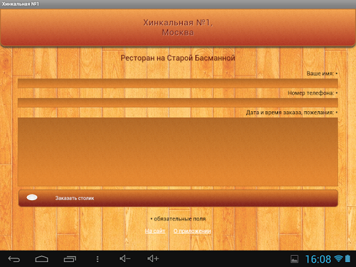 Приложение "Хинкальная №1" создано для удобства тех, кто привык работать не с сайтами, а с программами на телефоне и планшете. Наше приложение позволяет посмотреть меню в любом из ресторанов, заказать столик и посмотреть адреса и телефоны наших ресторанов. В дальнейшем функционал программы будет пополняться, пользуйтесь и пишите нам ваши замечания.