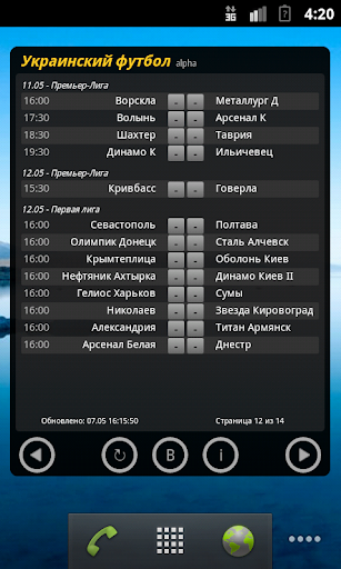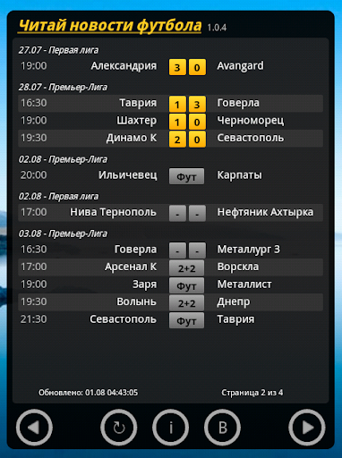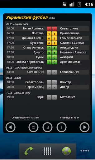 Футбольные матчи отображены в виде расписания, что поможет Вам вспомнить о грядущих футбольных состязаниях и узнать результаты прошедших матчей. Для большей информативности статусы матчей выделены различными цветами.