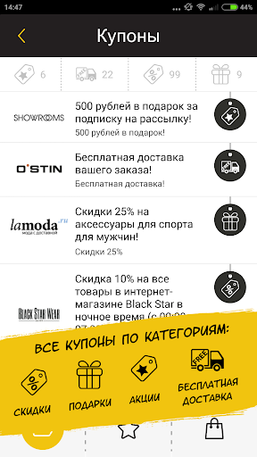 В нашем приложении “Черная Пятница” вы найдете тысячи самых актуальных промокодов, купонов и акций на скидки до 90% в таких популярных магазинах: Mango, Adidas, Nike, Zara, Sapato, Lamodan ATLAS FOR MEN,Hoff, IBODY,KLINGEL, KupiVIP,LamodaRU, Mebelion.ru, myToys, Petshop, Pilotka BY, Quelle, SHOWROOM, SSkupidu, Trendsport, WENZ, Wildberries , RUYVES ROCHER, Мода Скидка, Связной, Сотмаркет, Уже Везу Шоп24, Эльдорадо, ЮниЗоо . Самая большая обновляемая база купонов от ведущих CPA компаний РФ. Оставаясь с нами вы сможете всегда обладать актуальными промо кодами для интернет покупок.