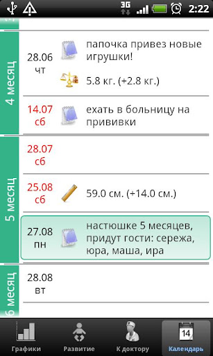 В приложении также есть графики роста и веса, которые покажут норму набора веса и роста малыша, помогут регулировать его вес. Закладка «К доктору» напомнит об обязательных прививках и посещениях врача.