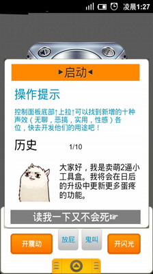 "大家好,我是卖萌2逼小工具盒。我将会在日后的升级中更新更多蛋疼的功能"我的前身是个震动器软件,是的,除了震动我什么都不会干", "就像手机上的手电筒只会亮闪光灯."