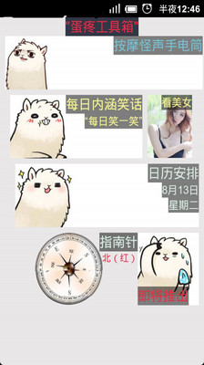 1震动按摩暖身/闪电筒/摇出怪声/每日看笑话/指南针/日历安排闹钟/看美女