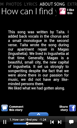 A true music album is now 3 equal elements together: Music + Graphics + Story = 3plet, a revolutionary app, the new music industry format. Add here Song Lyrics, Music Videos and integration with Facebook and you get a wholistic digital piece of art, delivered to you straight from the artist! The New Era of music albums is here!