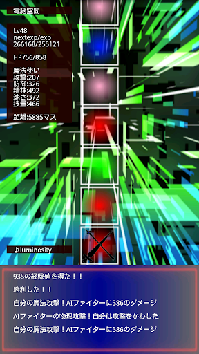 自動戦闘、タップをすれば戦闘が進みます。勝っても負けても経験値獲得可、負けた場合はペナルティーとして100マス戻されます。攻撃時は物理攻撃か魔法攻撃でダメージの大きい方を自動的に選択します。