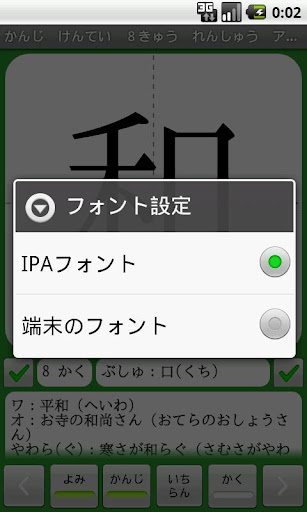 「フォント設定」・・・フォントを切り替えを行います。IPAフォント、もしくは端末のフォント。