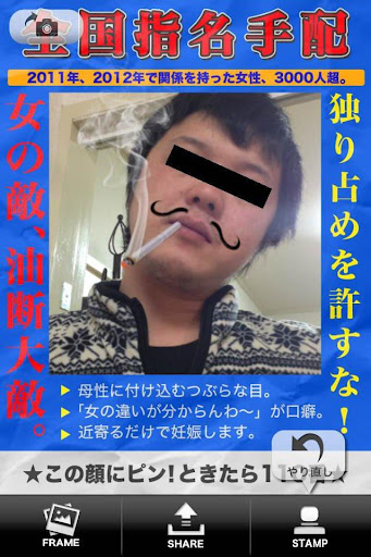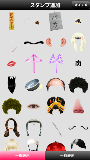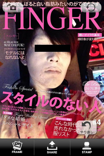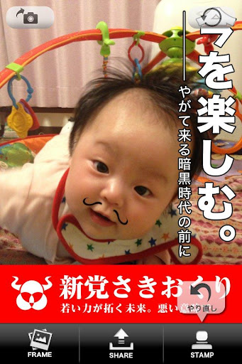 単純なアプリなんで説明とか特に無いんですけど、要するに撮った写真にいろんなフレームやスタンプを付けて楽しくいたずらしちゃおうっていう、カメラアプリです。