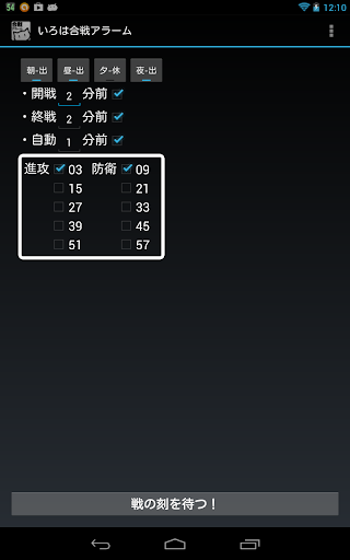 サンプル画像の様に設定すると、朝戦・昼戦・夜戦にアラームでお知らせします。