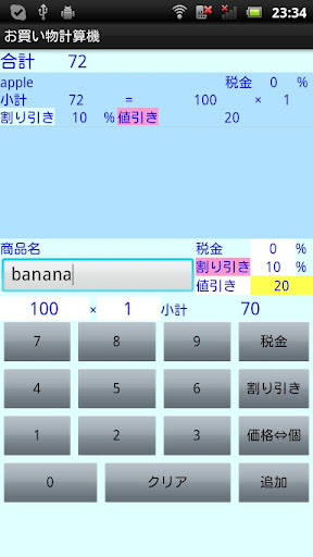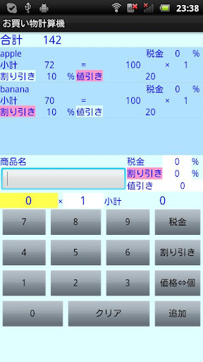 値段、個数、税金、割り引き、値引きを入力しリストに追加すると合計が出ます。