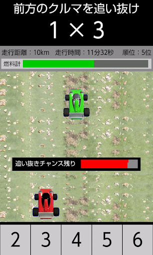先行する5台のクルマを追い抜き、30km走行(30問正解)にかかったタイムを競います。