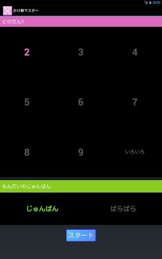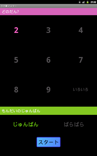 - 2から9の段、または、ランダムの"いろいろ"の段を選べます
