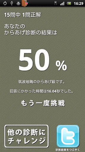 からあげ診断は、からあげに関するの問題を詰め込んだからあげへの知識を深める為のアプリの決定版です。診断結果はTwitterにつぶやくこともできますので、100点を目指してください。また、OpenFeintにも対応しています。