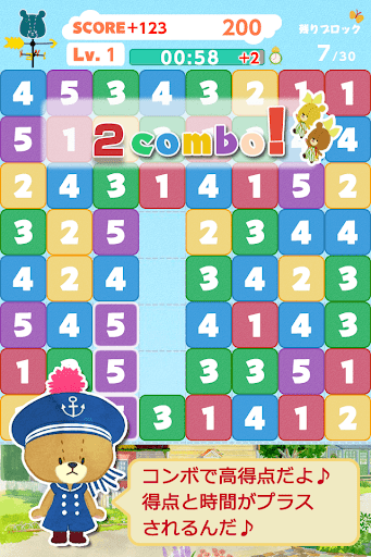 同じ数字のブロックを縦または横に3つ以上揃えると消えます。